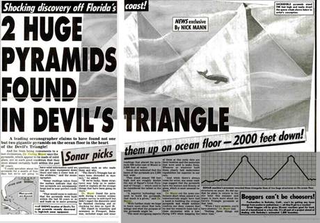 Több víz alatti építményt és piramist is felfedezett már Florida és a Yucatán-félsziget partvidékén. Benik több felvételt készített a piramisról; egyet éppen akkor, mikor az felfénylett. Azt állította, hogy amikor a piramis fehéresen felfénylett, minden alkalommal feliratok jelennek meg a felszínén. Ez a nyilatkozat méginkább felkeltette a közvélemény érdeklődését! Az Atlantisz-hívők és az UFO-kutatók is magukénak tudták a piramist. Egyesek azt állították, hogy végre Atlantisz nyomaira bukkantunk, míg az UFO-kutatók földönkívüli létformák bizonyítékának tekintették, s egyfajta jeladónak vélték, mellyel az idegeneknek jelezhetünk (feltéve, ha valaha rájövünk a használatára). Megint mások csillagkaput láttak benne, melynek segítségével utazhatunk térben és időben. Egy 1999-es eset éppen ezt a lehetőséget teszi valószínűvé… 1999. május 12-én egy kétmotoros Aero Commander 500-as repülőgép Fort Lauderdale-ből Nassau felé tartott. Az irányítótoronyból radaron követték a repülőgépet, mely félúton kísérőt kapott, majd egy UFO-szerű jel suhant át a képernyőn, s az Aero Commandernek hirtelen nyoma veszett.